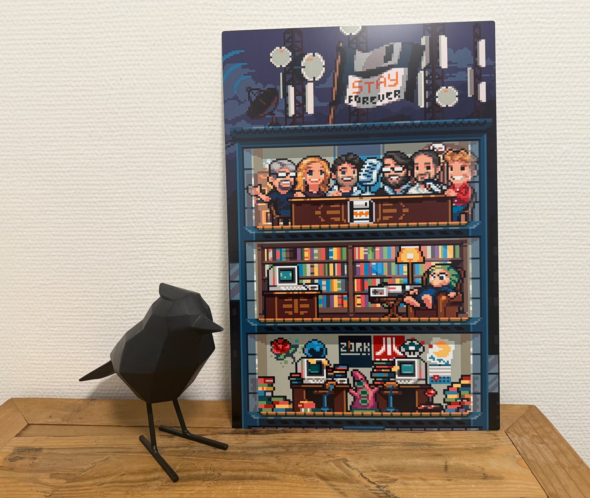 Das SFHQ-Motiv zeigt das ikonische Hauptquartier der Stay Forever-Crew in liebevoll gestalteter Pixeloptik. Gedruckt auf stabilem Metall wirkt das Motiv gestochen scharf, detailreich und modern – ein dezenter Blickfang für Arbeitszimmer, Gaming-Ecke oder Studio.