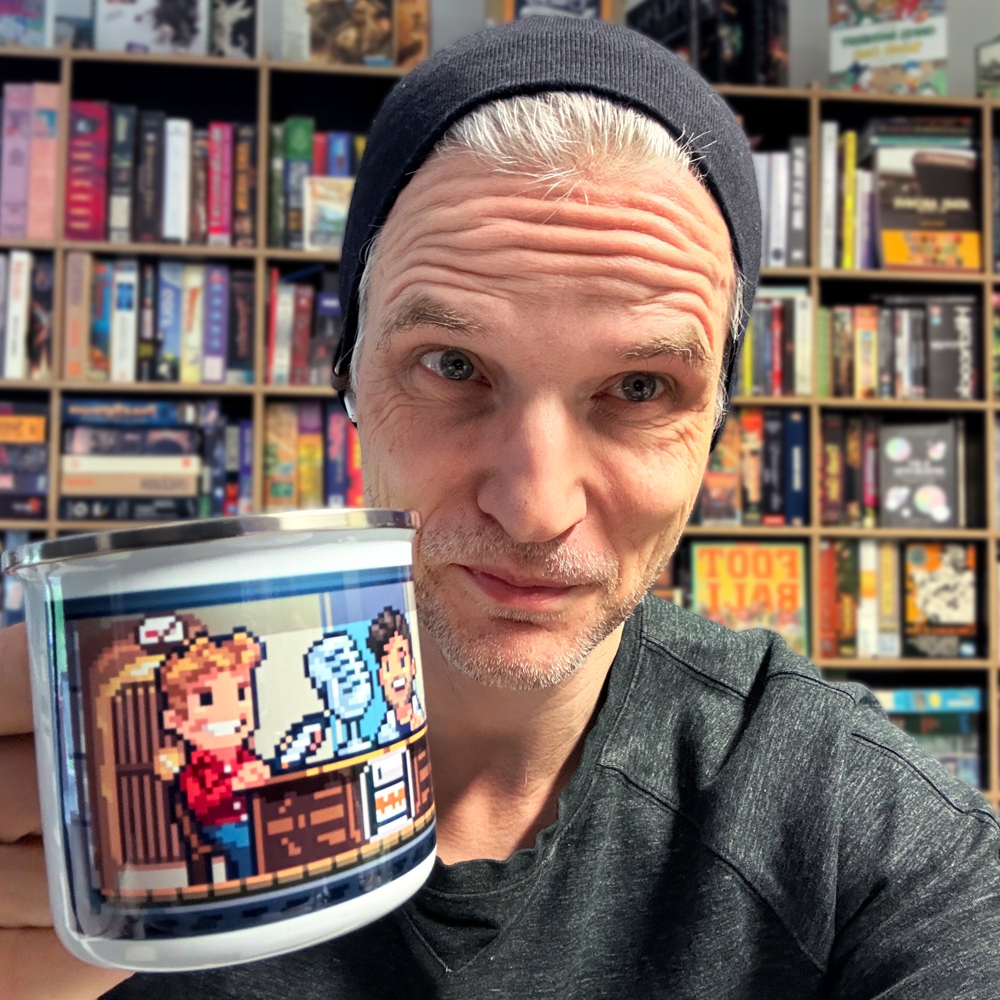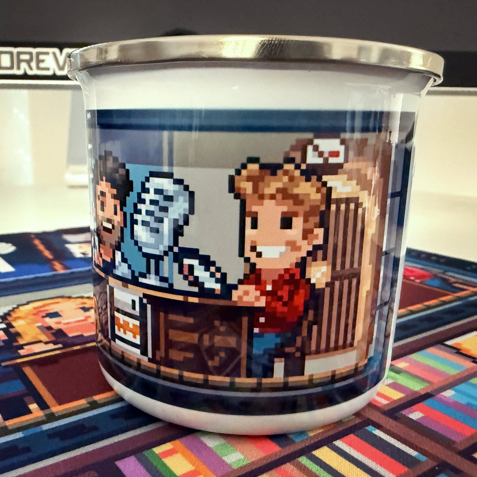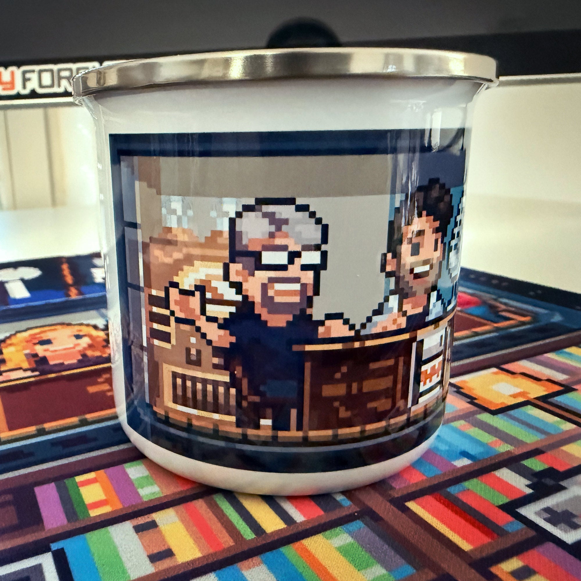 Egal ob Morgenschnapps, Abendbier oder alles dazwischen – dieser Emaillebecher ist das richtige für alle Gelegenheiten, von Camping bis Büro! Er ist robust und glänzend mit einem lebendigen Druck, der die Spülmaschine überlebt. Der bunte Druck zeigt die drei Podcaster von Stay Forever bei der Arbeit, in einem gloriosen Pixelmotiv von Milos Kostic.